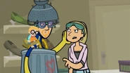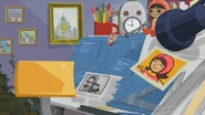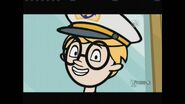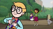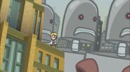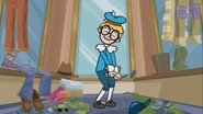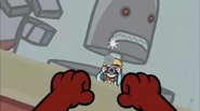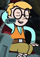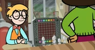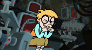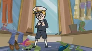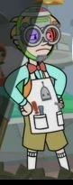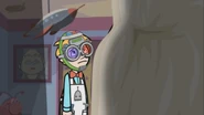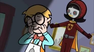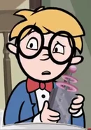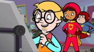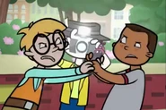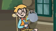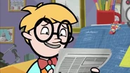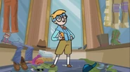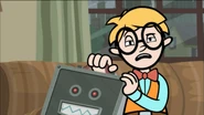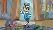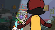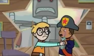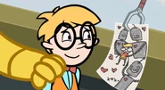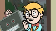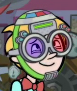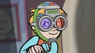 He wears his robot-building outfit over his usual outfit. Most visible is his white apron with the design of one of Tobey's standard robots on the front with two pockets, one of which has a screwdriver and a hammer. On top of his glasses are what appear to be a pair of goggles with the right lens blue and the left lens red. On top of Tobey's head is an elaborate helmet with a bright green chinstrap and two bright red and blue buttons on top.