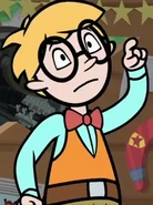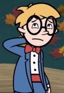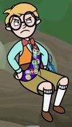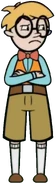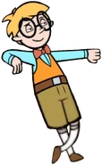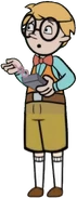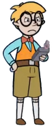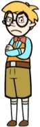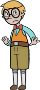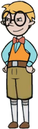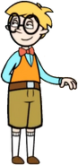 Tobey has short blond hair that sticks up in the back, pale skin, round glasses and a well-built stature. His typical outfit of a blue shirt with an orange vest over it, a red bowtie, brown pants hold up with a darker brown belt, white knee socks, and brown shoes similar to Becky's.